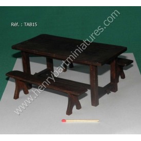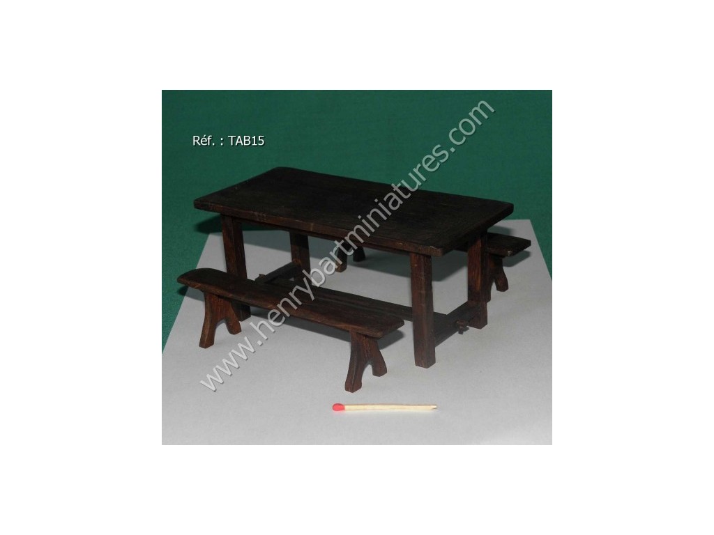 ENSEMBLE de 2 BANCS + 1 TABLE en chêne massif, teintés foncé et cirés