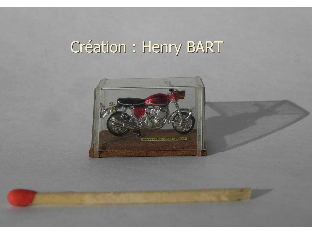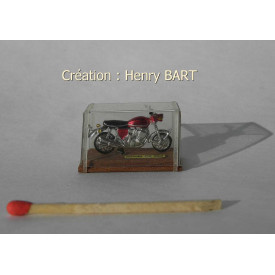 MOTO Honda CB750 rougeMoto miniature de collection en boîteSocle en bois/couvercle transparentDimensions de la boîte :Longueur 31 mm x 19 mm x 15 mmLa moto et sa boîte
