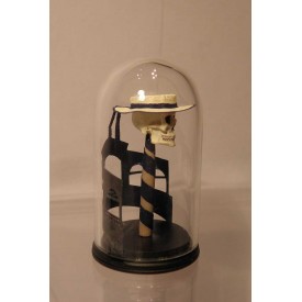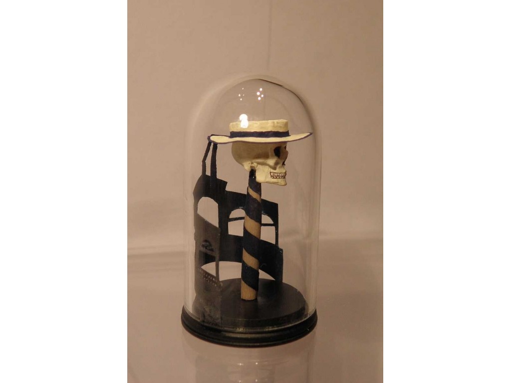 Globe façon Napoléon III contenant un crâne peint à la main, coiffé d'un chapeau de gondolier avec ruban bleu foncé, monté sur pieu d'amarrage. Silhouette du RIALTO à l'arrière plan.