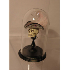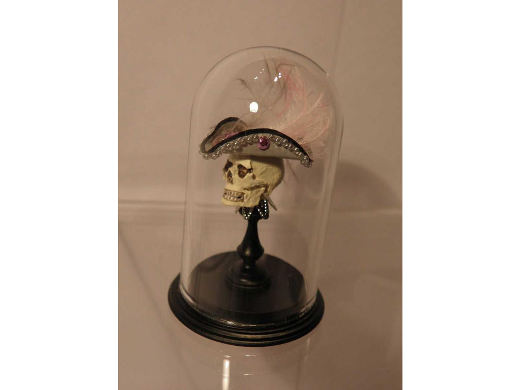 Globe façon Napoléon III contenant un crâne peint à la main, coiffé d'un tricorne gris avec plumes, strass et perles, monté sur calotte argentée et pied tourné.