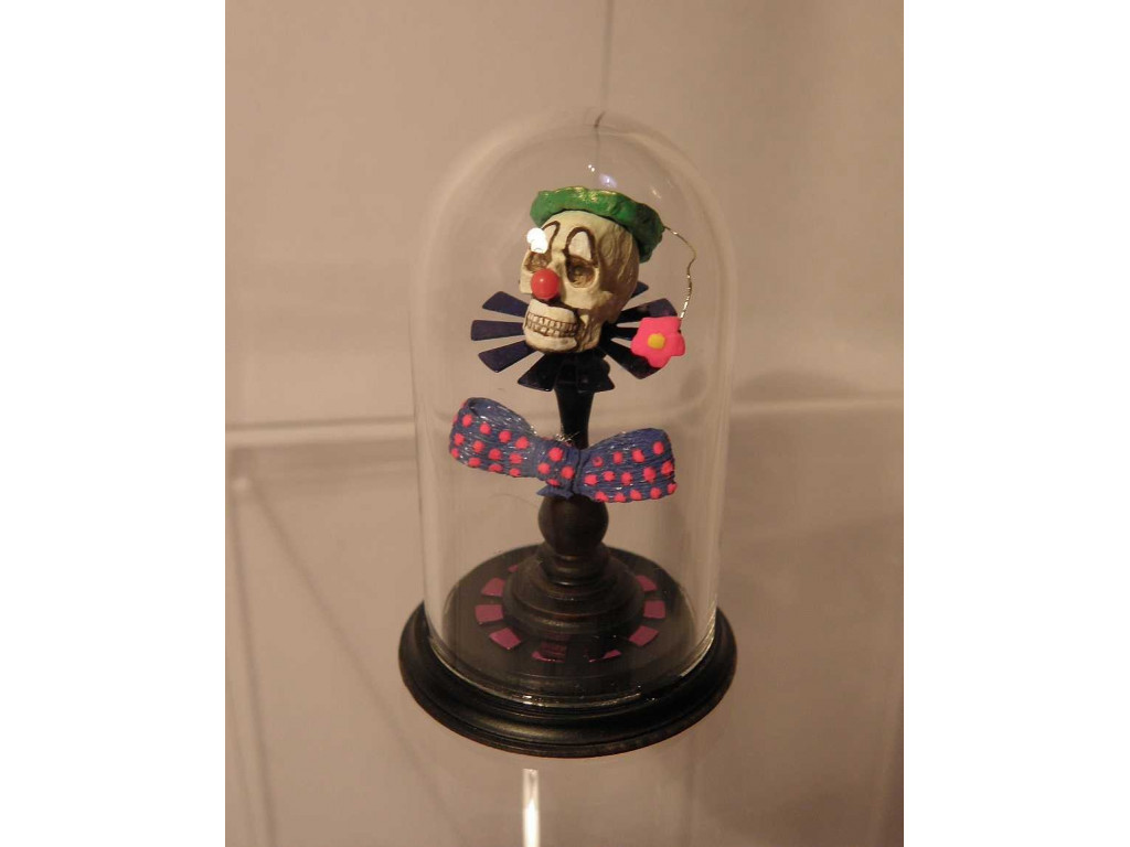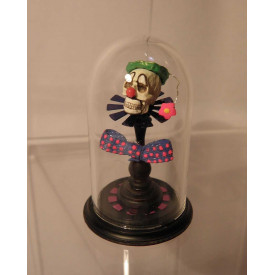 Crâne peint à la main, maquillage blanc et nez rouge (bille de verre de Murano), coiffé d'un chapeau vert métallisé et fleur rose, monté sur collerette bleue métallisée et pied tourné. Un noeud papillon bleu à points roses posé sur le pied. Une collerette rose métallisée posée sous le pied.