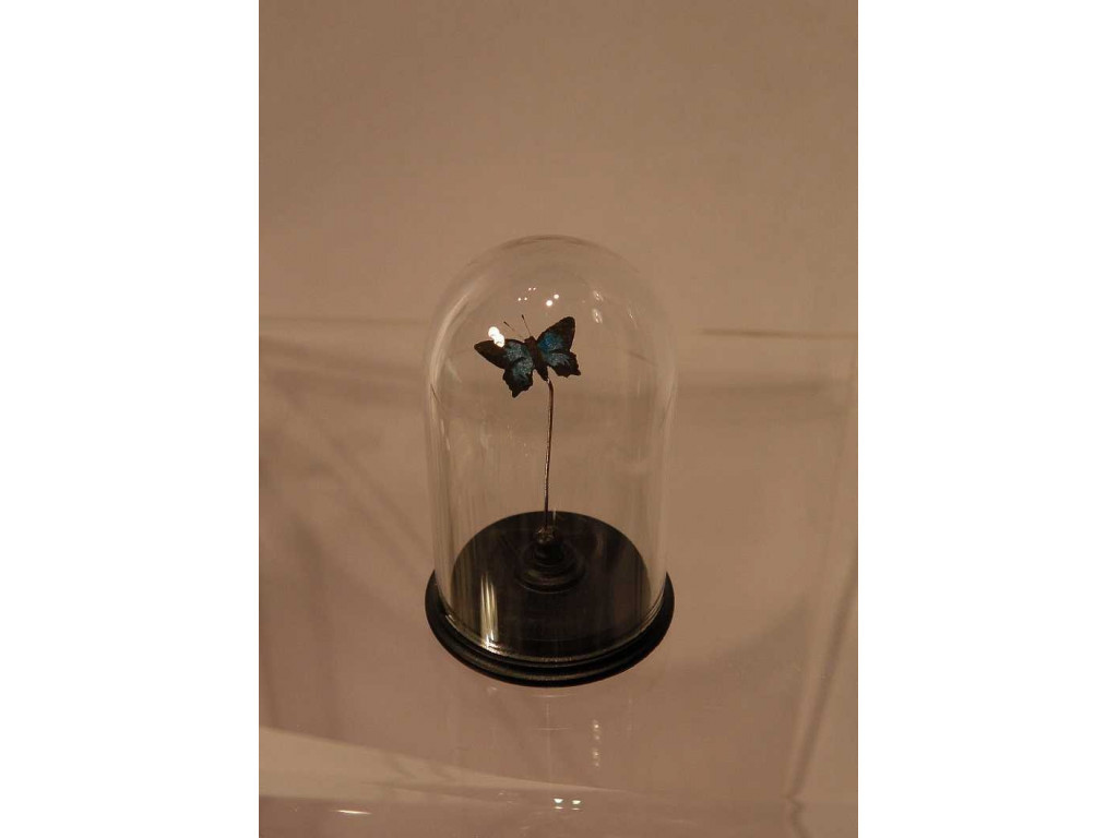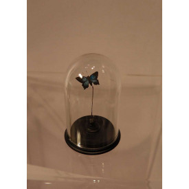 Globe façon Napoléon III contenant un papillon exotique peint à la main recto-verso, monté sur tige et micro-socle.