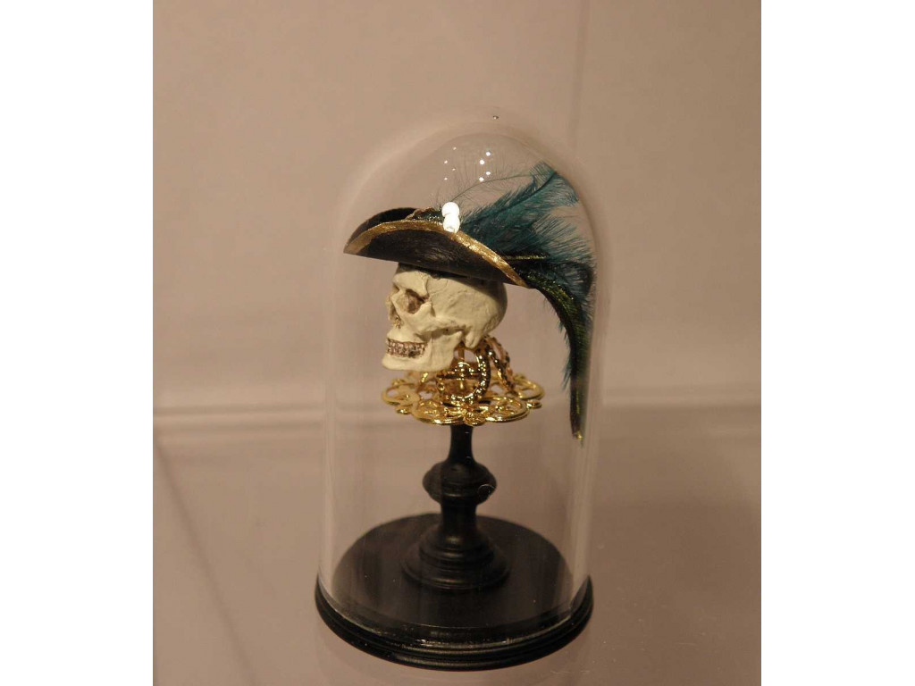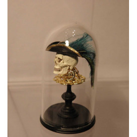 Globe façon Napoléon III contenant un crâne peint à la main, coiffé d'un tricorne noir bord doré, avec plumes et bijou doré, monté sur calotte et estampe dorées et pied tourné.