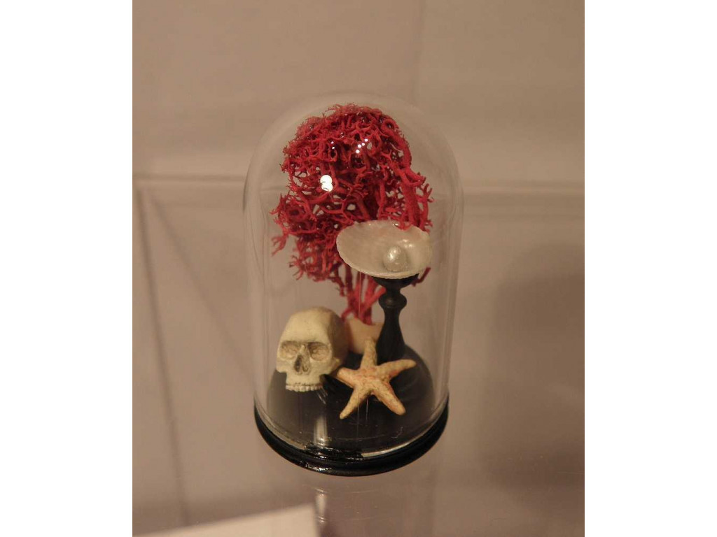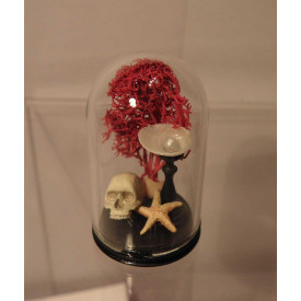 Globe façon Napoléon III contenant un crâne peint à la main posé à côté d'une étoile de mer modelée et peinte à la main, pied tourné avec coquillage et perle, une branche de corail rouge à l'arrière plan.