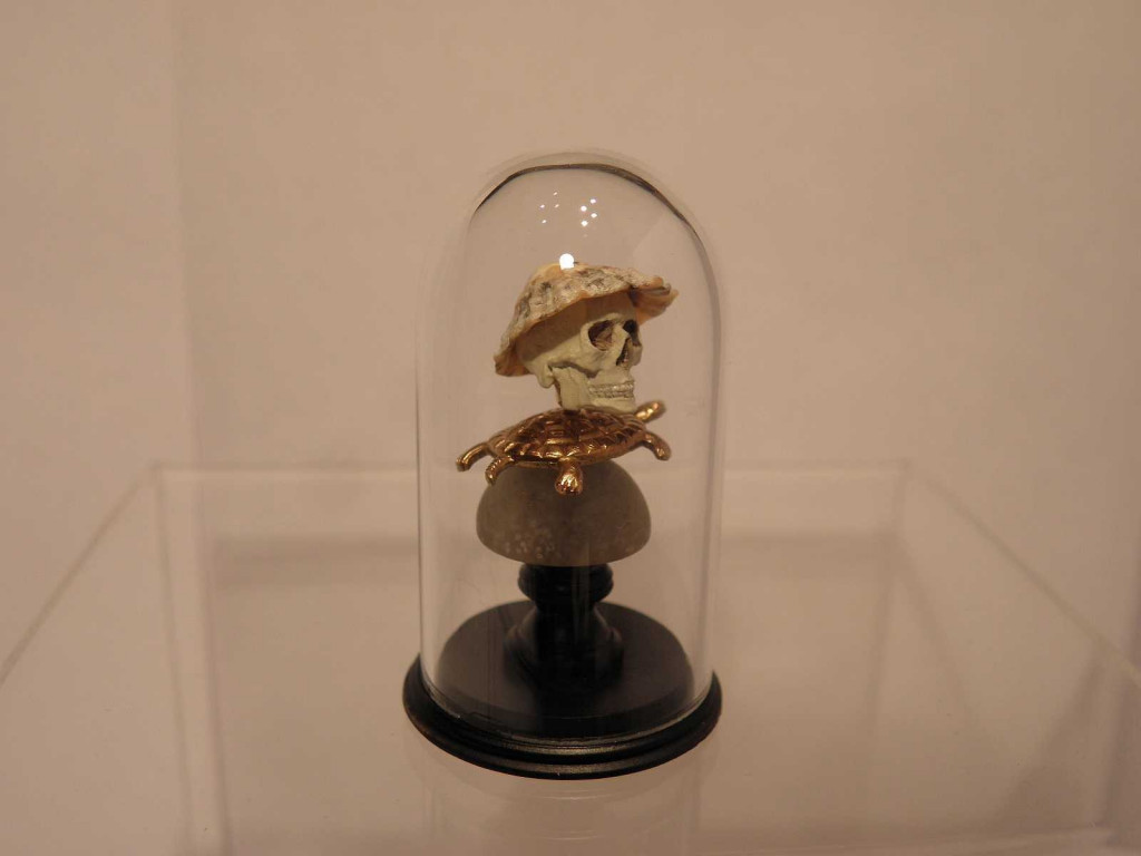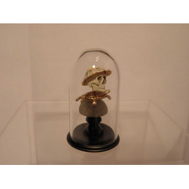 Globe façon Napoléon III contenant un crâne peint à la main coiffé d'un coquillage, monté sur pied tourné, perle en verre translucide et tortue dorée.
