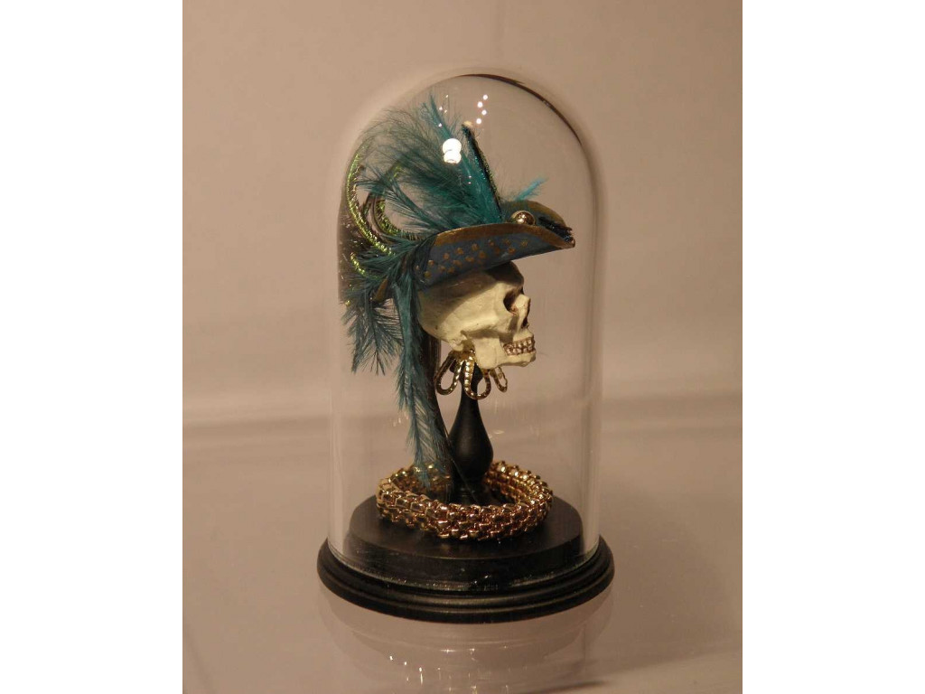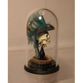 Globe façon Napoléon III contenant un crâne peint à la main, coiffé d'un tricorne bleu/vert avec plumes, strass et perle dorée , monté sur calotte dorée et pied tourné.