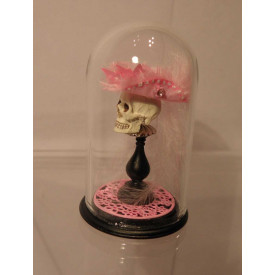Globe façon Napoléon III contenant un crâne peint à la main, coiffé d'un tricorne rose avec plumes et papillons, monté sur calotte argentée et pied tourné. Estampe fleurie ajourée peinte en rose.
