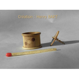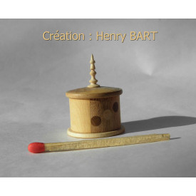 Assemblage de buis, merisier, houx et bois exotiqueLe couvercle de cette boîte est une toupieTournage d'art miniature échelle 1/12èmePièce unique de collectionHauteur totale = 31.30 mmDiamètre maxi = 22.85 mmLa BOITE