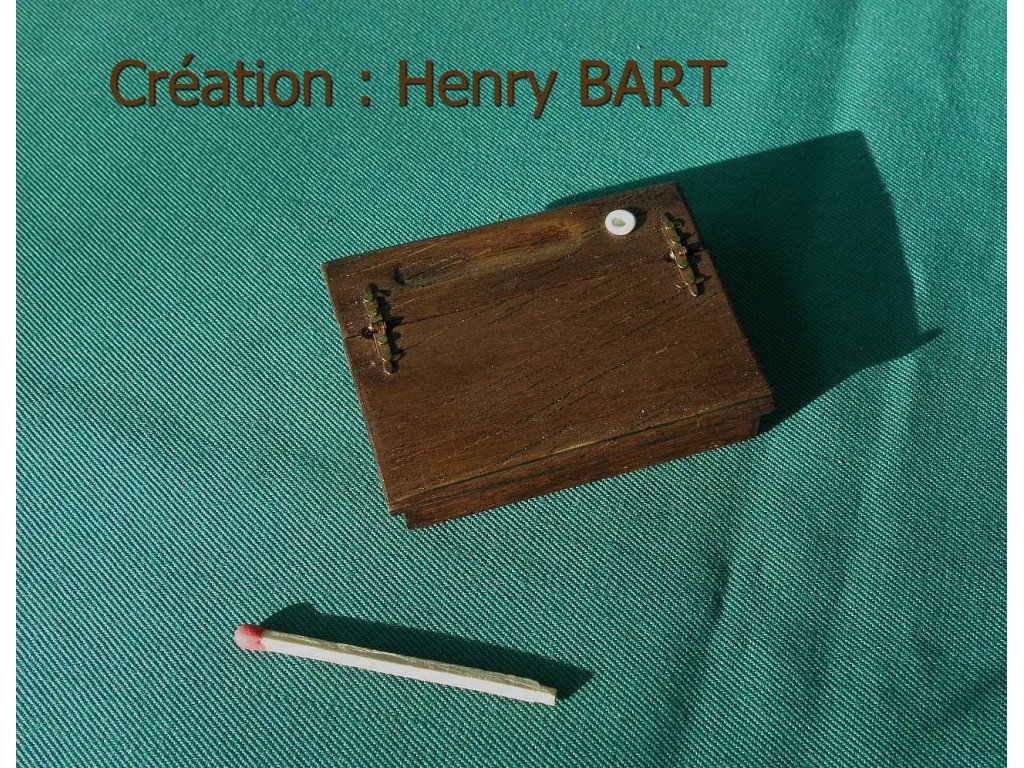 ÉCRITOIREen ramin teinté non ciré, non verni.avec son encrier en buis tournépeint en blanc.Ferrures en cuivre.Dimensions = 61.5 x 47.3 x 15 mmMiniature échelle 1/12èmeL'ÉCRITOIRE