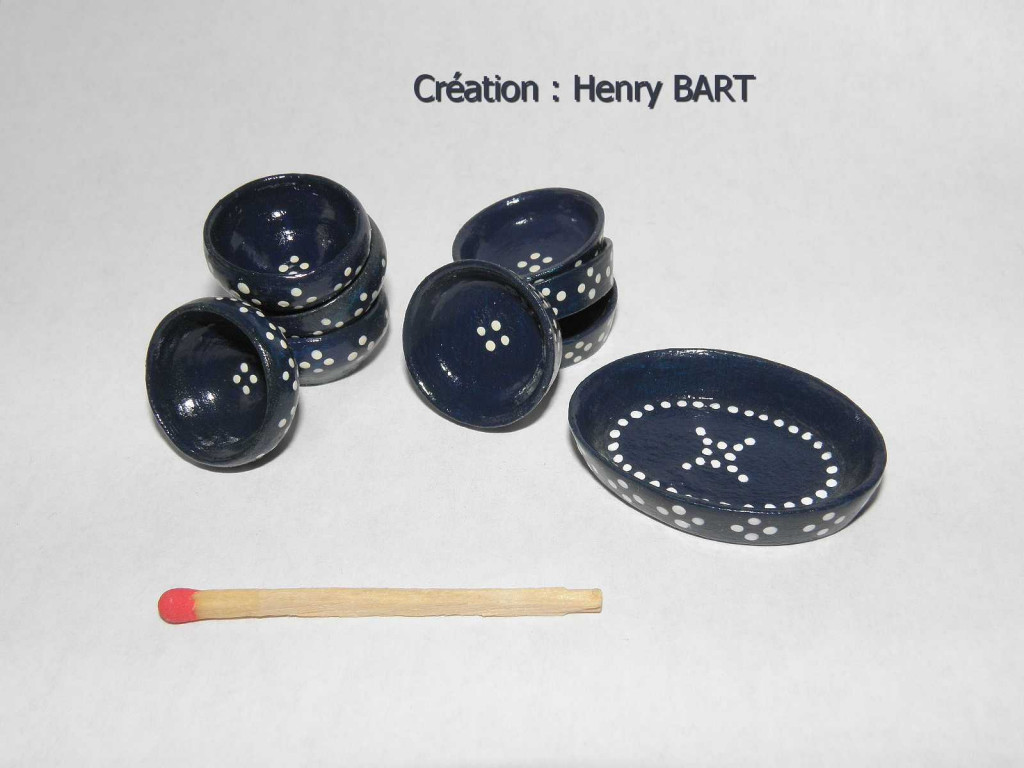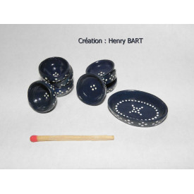 ENSEMBLE de vaisselle bleu foncé/points blancsEntièrement peintet décoré à la mainpar nos soins.Miniature échelle 1/12èmeL'ENSEMBLE de 9 pièces